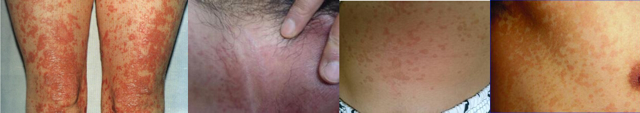 花斑糠疹初起损害为围绕毛孔的圆形点状斑疹,以后逐渐增至甲盖大小,边缘清楚,邻近损在可相互融合成不规则大片形,而周围又有新的斑疹出现。