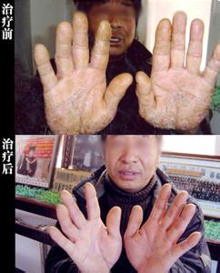 王先生,宁波人,54岁,在家以前以养殖业为主,患有湿疹近8年,严重时,双手部皮肤起小丘疹水泡,后来发展成渗液、干燥、结痂、粗糙肥厚与裂口,并伴着钻心的痒,搔得血迹斑斑,特别夜里瘙痒得难以入睡。白天又不能好好的干活,年年治疗,好了又复发,一直不能根治。为了治好湿疹,也寻求了不少医院,到处寻医问药,吃过的药不知道有多少种,花了几万元的医疗费,结果无济于事。