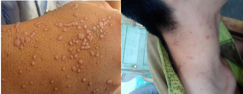 大多数症状的发生都是突然出现的,一般表现为针头至米粒大或稍大的扁平丘疹,呈圆形或不规则的形状,略高于皮肤的表面,也可显著地突起而形成圆顶状。表面 光滑,境界清楚,触之较硬,为浅褐或灰白、淡黄或正常皮色。多数分散存在或密集成群,有的互相融合或沿抓痕呈条状分布。一般无自觉症状,有微痒。