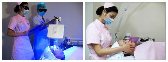 (痘痘患者正在接受中药倒膜和红蓝光治疗)