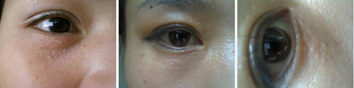 患者李某,女,26岁,深圳市福田人.眼部密布褐色扁平丘疹五年,曾于多家医院就诊,均诊断为"扁平疣",中药、西药都用过了,病情不见好转,反而逐渐加重.到深圳新兴皮肤病医院就诊,给予"中药无痕去疣"治疗,经过治疗后,面部疣体全部脱落,仅留有原疣体部色素斑.患者直呼神奇。