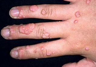 寻常疣是千日疮的中医名称,俗称刺瘊,由HPV-2.4型、7型引起,儿童及青少年易患该病,常见于手背、手指及足缘等处,小丘疹状,表面角化粗糙,坚硬,呈灰黄、污黄或污褐色。呈乳头瘤样增生,角化过度间角化不全,棘层上部及颗粒层细胞有空泡化。表皮突处长,疣周围向内弯曲呈抱球状,真皮乳头上延,血管扩张。寻常疣病程一般为1-2年,有自限性,可自行消退,也可大规模导致全身发病。
