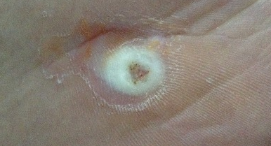 跖疣一般好发于足底,初发时表现为角质状的小丘疹,而后逐渐增大,丘疹一般为灰褐色或灰黄色,表面粗糙不平,与周围正常皮肤分界清楚,中间凹陷,若用刀具祛除表面角质后,会有点状出血,系真皮乳头血管破裂,微量血液外渗凝固,故形成小黑点,一般常常发病于足跟,时而单发,时而多发,病程较慢,患者会偶遇明显的压痛感出现。